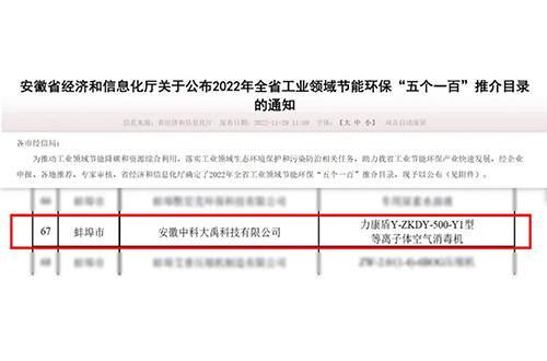 入選2023年全省工業(yè)領(lǐng)域節(jié)能環(huán)保“五個一百”推介目錄(節(jié)能環(huán)保新產(chǎn)品新裝備:G-ZKDY-2500-Y1型等離子體空氣消毒機)
