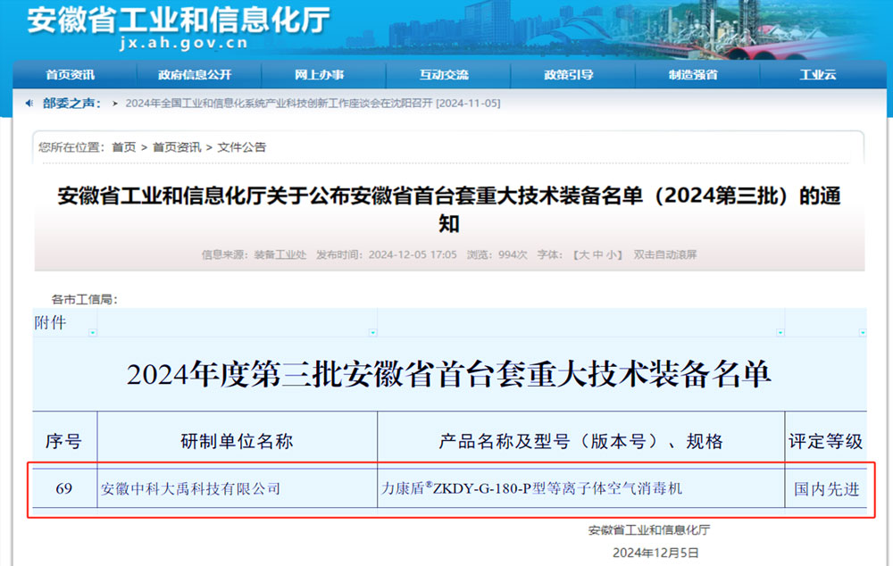 力康盾?ZKDY-G-180-P型等離子體空氣消毒機入選2024年度第三批安徽省首臺套重大技術(shù)裝備,評定等級:國內(nèi)先進(jìn)